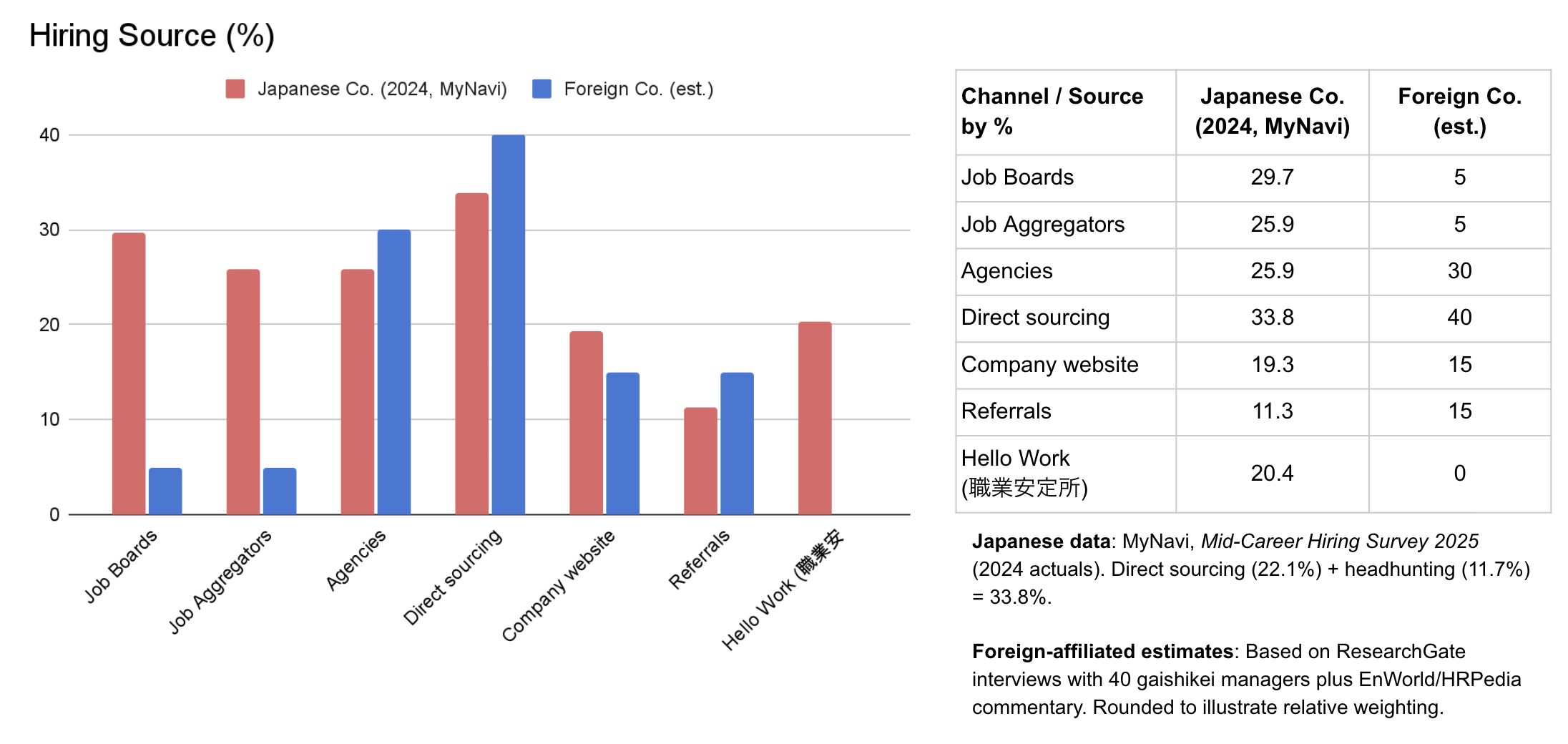 Foreign-affiliated firms show the opposite pattern. Research with 40 gaishikei managers highlights direct sourcing (~40%) and agencies (~30%) as the main channels, with referrals and company sites adding ~15–20%. Job boards and aggregators barely contribute (~5%).