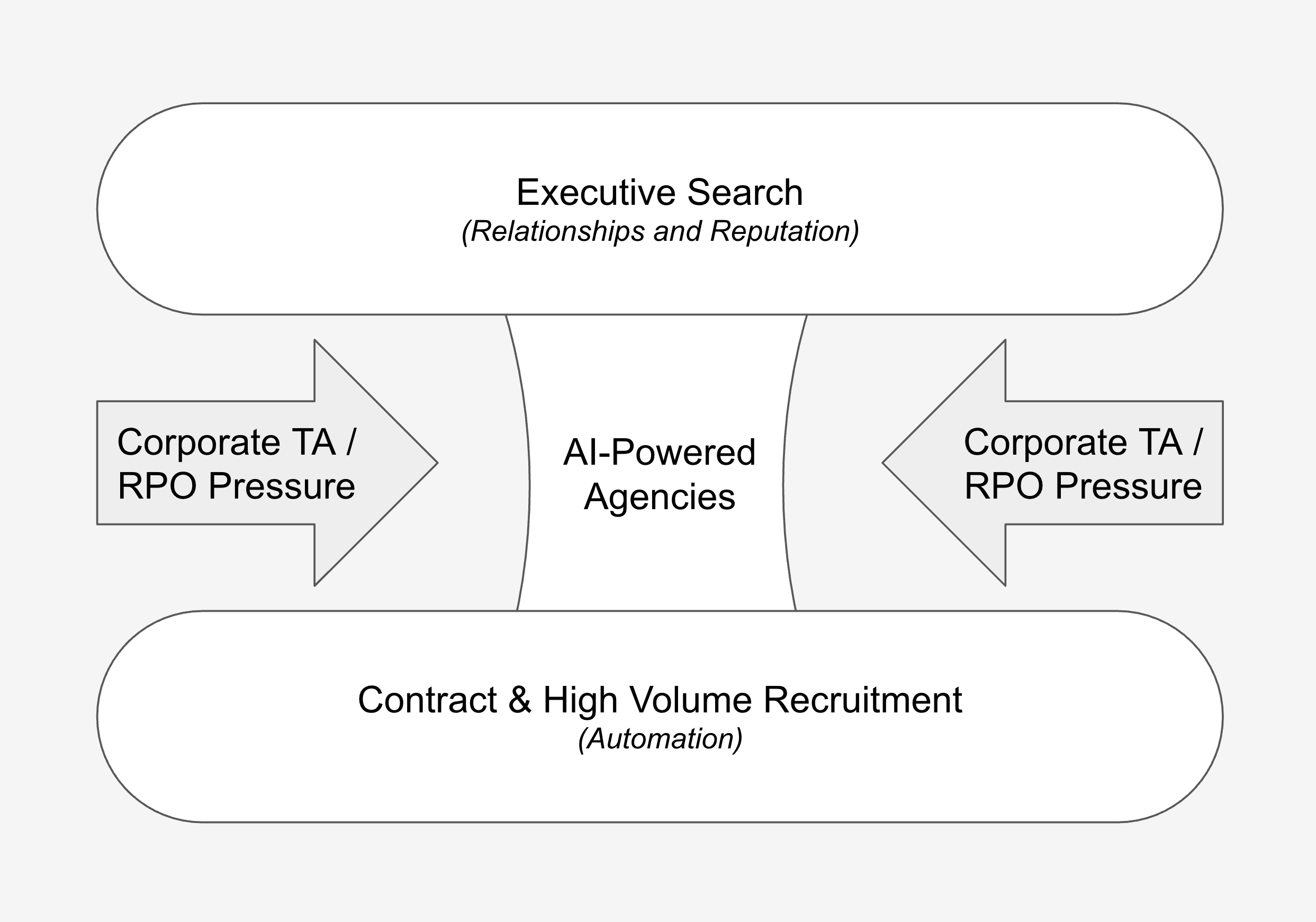 Tech lets in-house teams do more, especially for early and mid-career roles. If they use agencies, they’ve got RPO (aka “embedded solutions”) for volume or specialised skills.